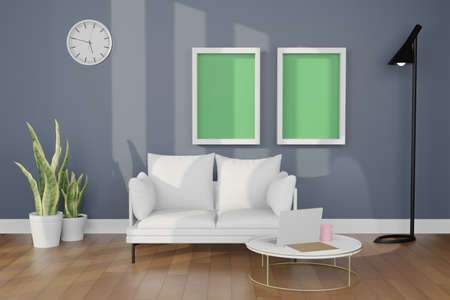 Interior of modern living room with beige sofa, lamp and picture frame. 3d render