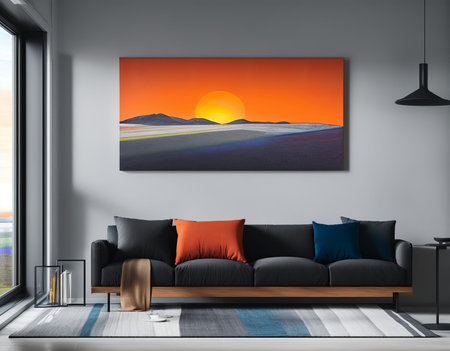 A contemporary living room with a framed photograph of a mountain sunset on a gray wall. The room is decorated with a beige sofa, a wooden coffee table, and two lamps. There is a plant on the floor and a window with a view of trees.