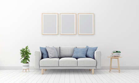 White living room interior with a white sofa and a framed poster. 3d rendering mock up