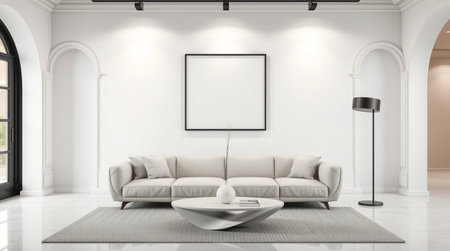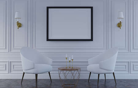 Mockup poster frame in Minimal style. interior with modern furniture. Minimalist interior design. living room frame design. copy space white background. modern white house concept. 3D illustration.