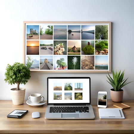 A modern workspace with a laptop displaying a digital portfolio of scenic images. showcasing creativity and professionalism. Perfect for illustrating digital marketing. design. or photography concepts.