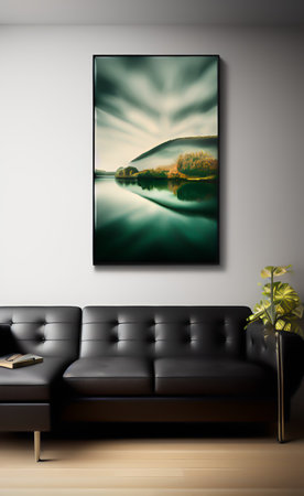 Mockup Wall Decor Frame Hangs In Cozy Minimalism Living Room With Com. T Sofa. Generative AI