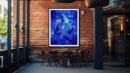vibrant blue poster illustration brick wall, city street, text abstract vibrant blue poster