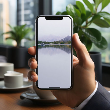 A modern smartphone stands against a clean, white background, its screen a window to a tranquil coastal landscape.
