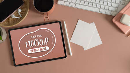 Top view of pink worktable with mock up tablet, notepad, accessories, supplies and coffee mug