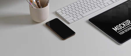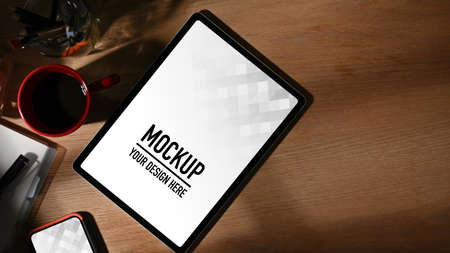 Top view of digital devices on worktable with mock up tablet, smartphone, camera and stationery