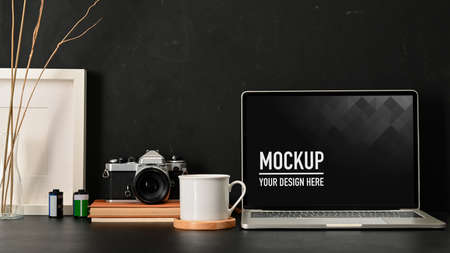 Close up view of workspace with laptop, coffee mug, camera, supplies and mock up frame
