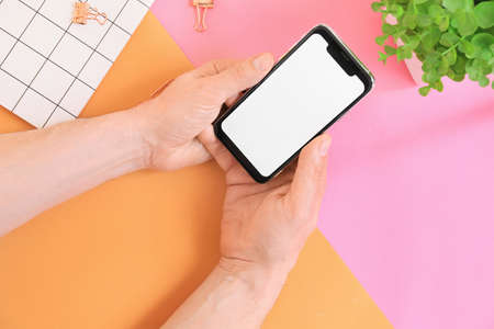 Overhead shot of young businesswoman holding blank screen smartphone in dark luxury workspace with office supplies