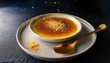 Overhead view of a cr?me br?l?e with a freshly broken caramelized sugar crust revealing smooth golden custard beneath. A golden spoon rests on the white ceramic dish, dusted with fine sugar granules. The rich yellow custard contrasts with the cracked brown sugar highlighting texture and indulgence.