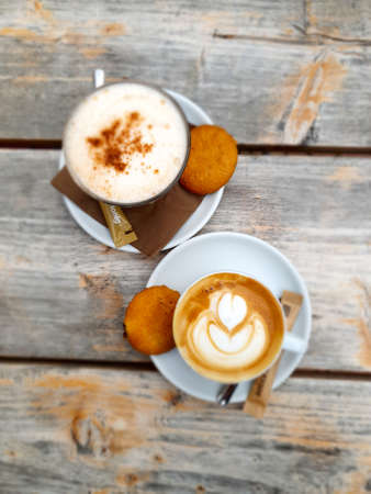 Coffee break and romantic mood concept. Cup of caramel cappuccino with heart shaped foam art made of lactose-free milk, served on wooden table in cafeteria