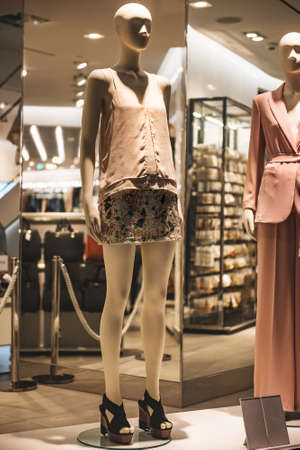 Milan, Italy - September 24, 2021: Mannequins standing in a window display of a clothing store.