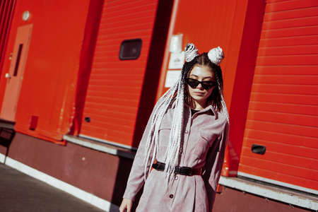 A young trap dancer with braids. Black ethnic girl with t-shirt, orange sunglasses and a jacket, urban post looking at the left