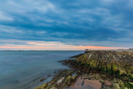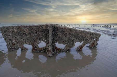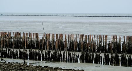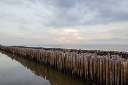 Bamboo wall and stone wall for protection against ocean waves. Sunset at the sea, Samut Sakhon, Thailand