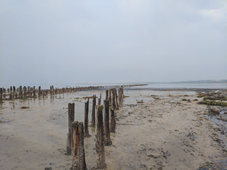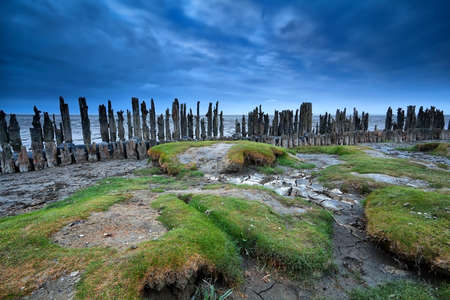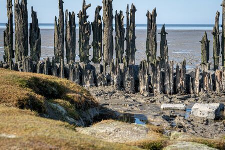 Wooden piles overgrown with algae, stuck in the shoreline of the sea, protection against waves.