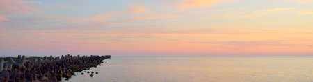 Baltic sea shore under a blue sky with glowing pink and golden sunset clouds. Rocky shore, breakwaters. Idyllic seascape. Latvia. Nature, environmental conservation, ecotourism. Picturesque scenery