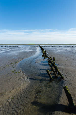 Coastline waddensea with wooden pole during low tide near village Moddergat in The Netherlands