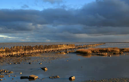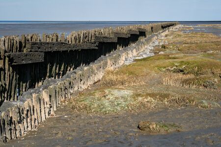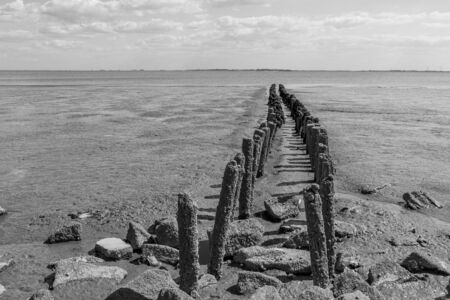 Fence with debris in the Wadden Sea at low tide along the coast with shells and mud flats, The Netherlands