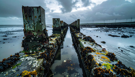 Cinematic shore photo of an abandoned groyne field at low tide, posts vanishing into mist with muted gradient shore for quiet melancholy.