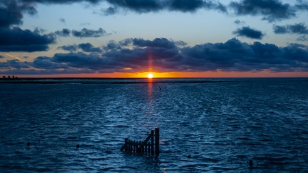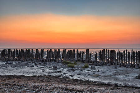 View of the Wadden Sea during sunset, at low tide. Wooden posts as a silhouette in the mud.