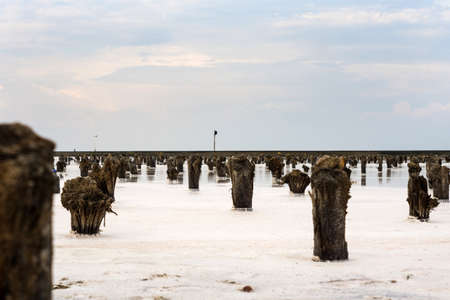 Salt Lake. Self-settling salt on wooden logs. Hypersaline water in a drying lake, an environmental problem. Ukraine