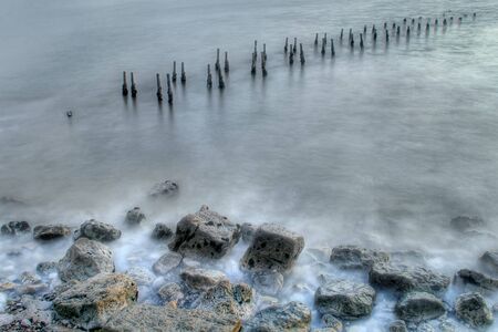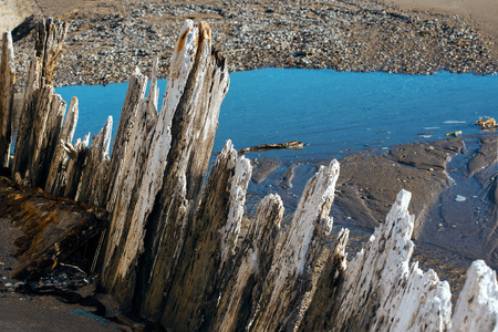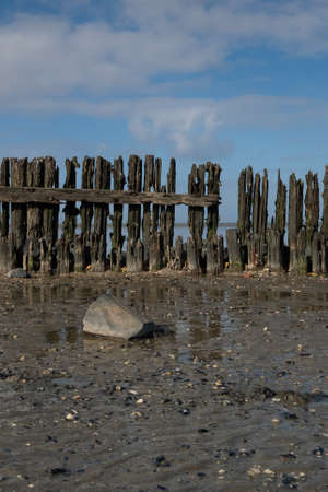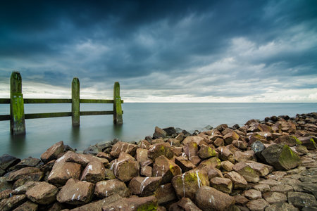 Dramatic shot of a wooden breakwater found at Hornsea Beach, East Yorkshire, UK.