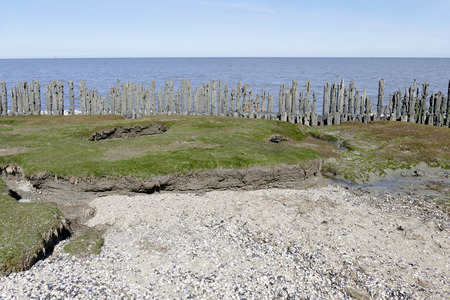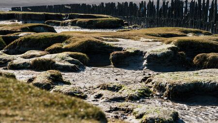Textures dry sea bottom and old dike at low tide, tidal marsh along the shore, vegetated mud flats along the Wadden coast, Moddergat, The Netherlands