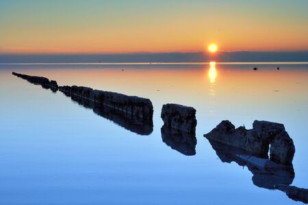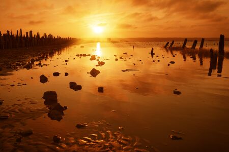 Beautiful sunny red sunset on the lake with stones, wooden posts and reflection, natural seasonal summer vacation background