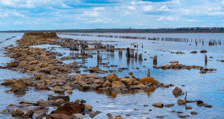 Coastline in zeeuwse village Yerseke with famous oysters and mussels wells during low tide, Zeeland, Netherlands