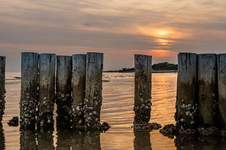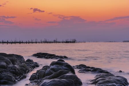 Evening sky and rows of bamboo sticks in the sea near Matchanu Shrine,Phanthai Norasing,Mueang Samut Sakhon District,Samut Sakhon,Thailand.