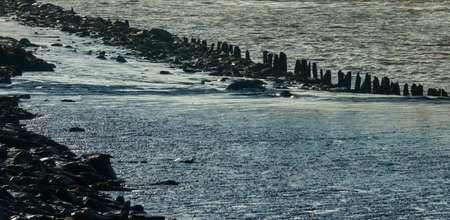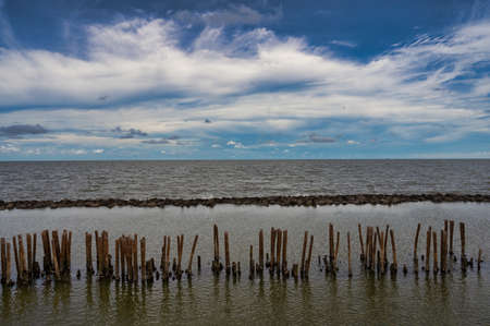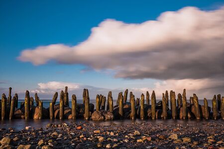 Beautiful landscape of coast of Baltic sea and old wooden breakwater at sunny cloudy morning