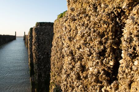At low tide, an ancient wooden groyne reveals its textured surface, covered in years of marine life.