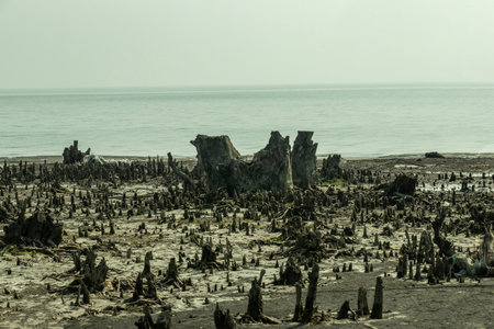 underwater beach with driftwood drifting in the mud at sunset, creating a post-apocalyptic ruins vibe. the vray tracing enhances the captivating atmosphere of the cityscapes and dutch landscapes. historical imagery blends with impressive panoramas, resulting in atmospheric woodland imagery. ai generated