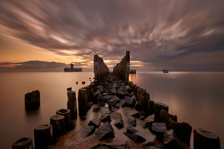Old torpedo launcher and breakwater landscape, Gdynia, Baltic sea, Poland