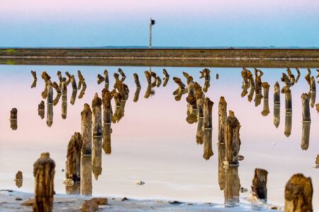 Evening on Kuyalnik salt lake in Odessa, Ukraine with old and ruined salt posts and a boat digging mud in the background