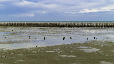 Mangrove roots and water and sand on the shore.Bamboo fence wall is breakwater for protecting the shore and mangrove forest from wave erosion and storm in sea background and sunshine in the morning.