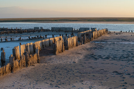 Ruins of old platforms for salt mining on the Elton salt lake on a May evening. Volgograd region. Russia