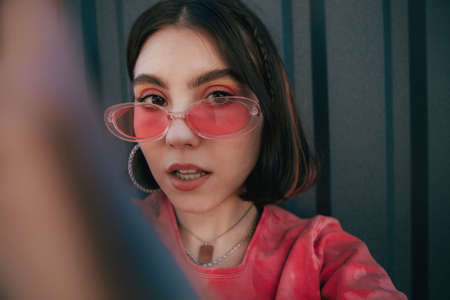 Young asian woman wearing vibrant street fashion and pink sunglasses