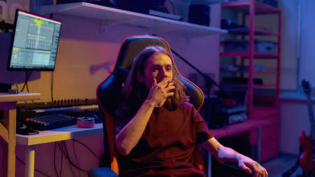 Streamer young man rejoices in victory professional gamer playing online games computer with headphones, neon color