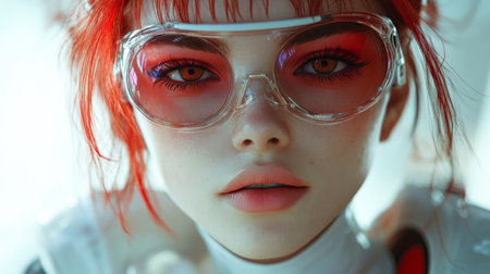 A woman with a distinctive style, wearing a vibrant red jacket with glowing elements and fashionable pink-tinted glasses, exuding a futuristic vibe.