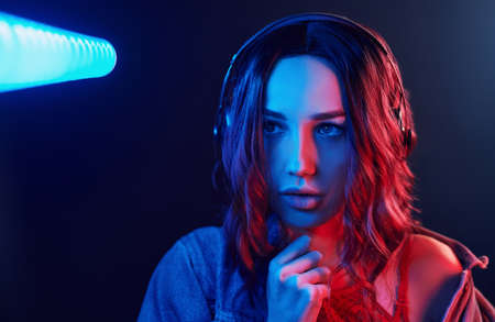Portrait of young girl that listening to music in headphones in red and blue neon in studio.