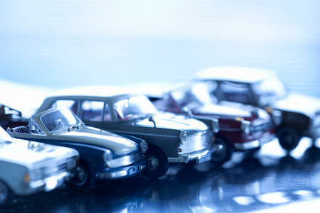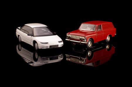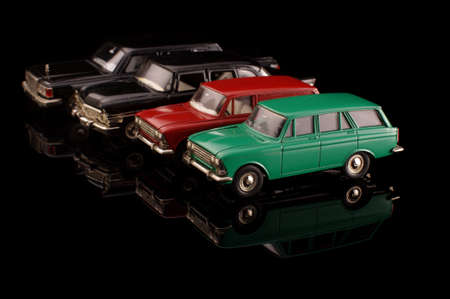 Vintage soviet die cast plastic and metal model cars on the dark reflective background