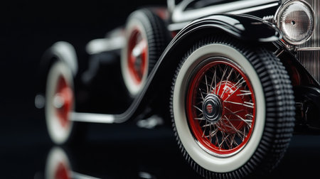 A detailed close-up of the wheels and grill of a vintage toy car on a shiny black background