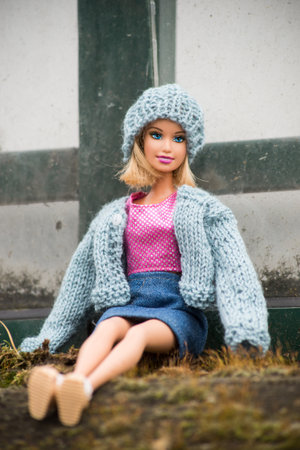 Mulhouse - France - 2 March 2021 - Portrait of Barbie doll wearing a woolen pullover and hat in a public garden