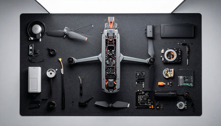 A top-down view reveals the intricate inner workings of a modern FPV drone, meticulously laid out on a technician's workbench.