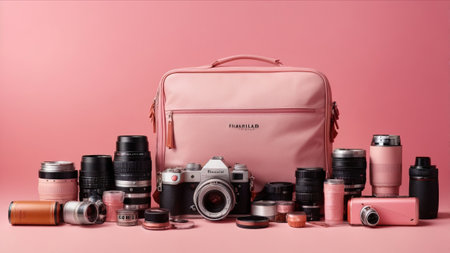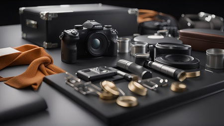A comprehensive flat lay arrangement of camera equipment and accessories, showcasing various lenses, bodies, and tools ideal for photographers and creators.
