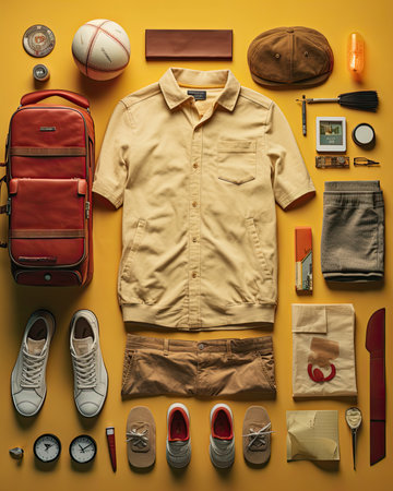 Outfit of traveler, student, teenager, young woman or guy. Overhead of essentials for modern young person. Different objects on yellow background. Vintage Knolling Flat Lays
