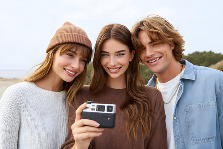 Three cheerful young adults are posing with a camera on a beach, surrounded by gentle waves and lush greenery, enjoying a fun day outdoors
