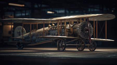 A stunning vintage bi-plane rests on a fog-laden runway, highlighting the beauty of early aviation designs, set against a moody, atmospheric backdrop.