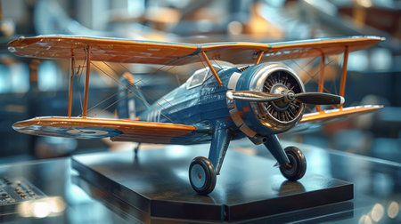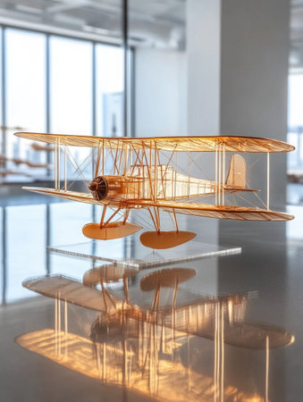 A detailed model of a Wright Flyer is showcased on a polished surface against a minimalist backdrop honoring Wright Brothers Day