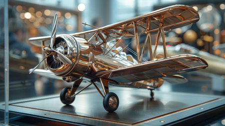 A wooden model of a plane is showcased on a display stand in a museum or exhibition. The intricately carved details of the aircraft are visible, highlighting the craftsmanship involved in creating the miniature replica.